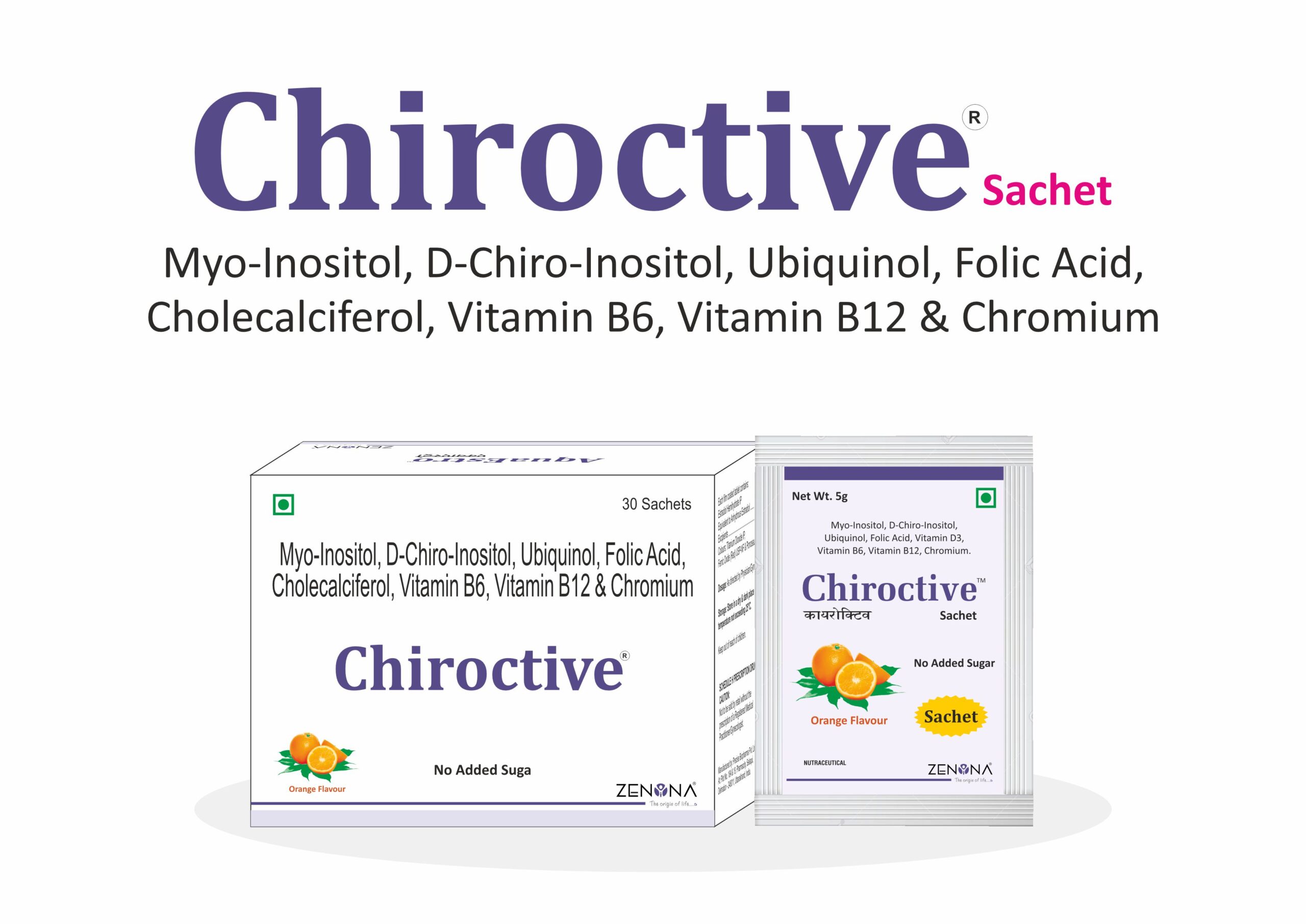 Chiroctive Sachet is a poly ingredient formulation intended to help manage female health suffering from PCOS. This improved combination of Chiroctive Sachet with Myo Inositol + D- Chiro Inositol fortified with select micro-nutrients Coenzyme Q10, Vitamin D2, L Methyl Folate, Vitamin D3,B6,B12 and Chromium) supports Women’s health during various conditions like PCOS and female infertility.